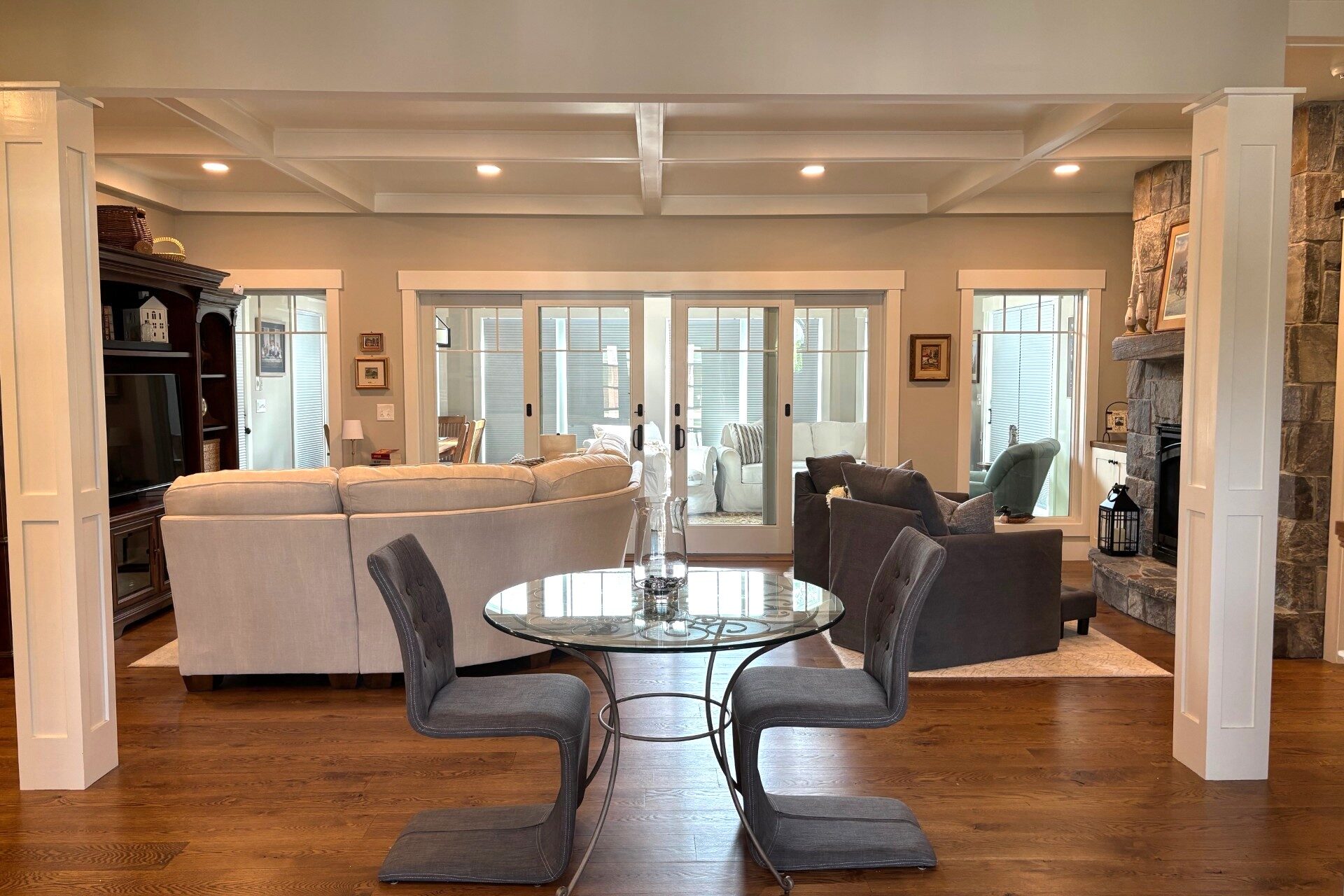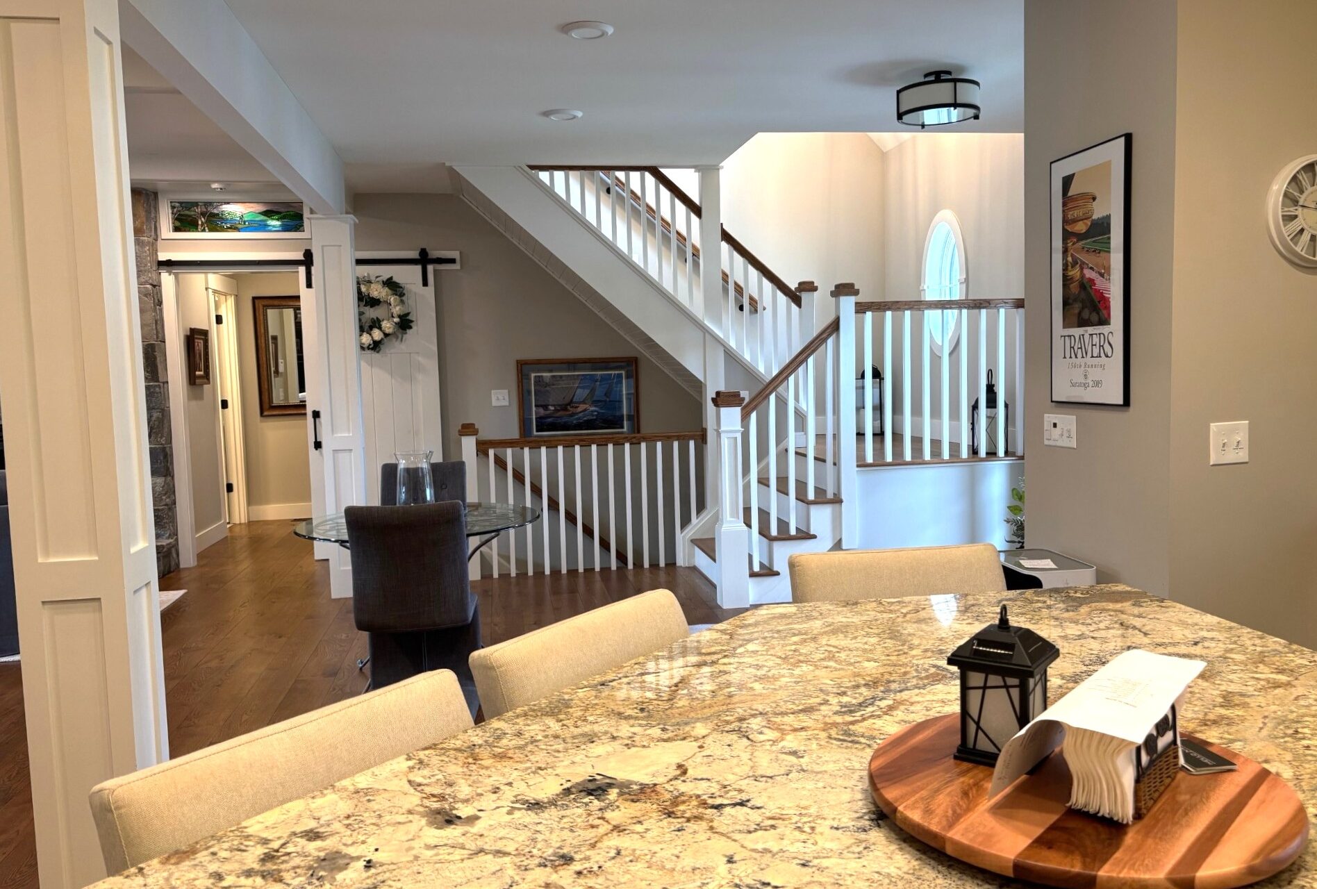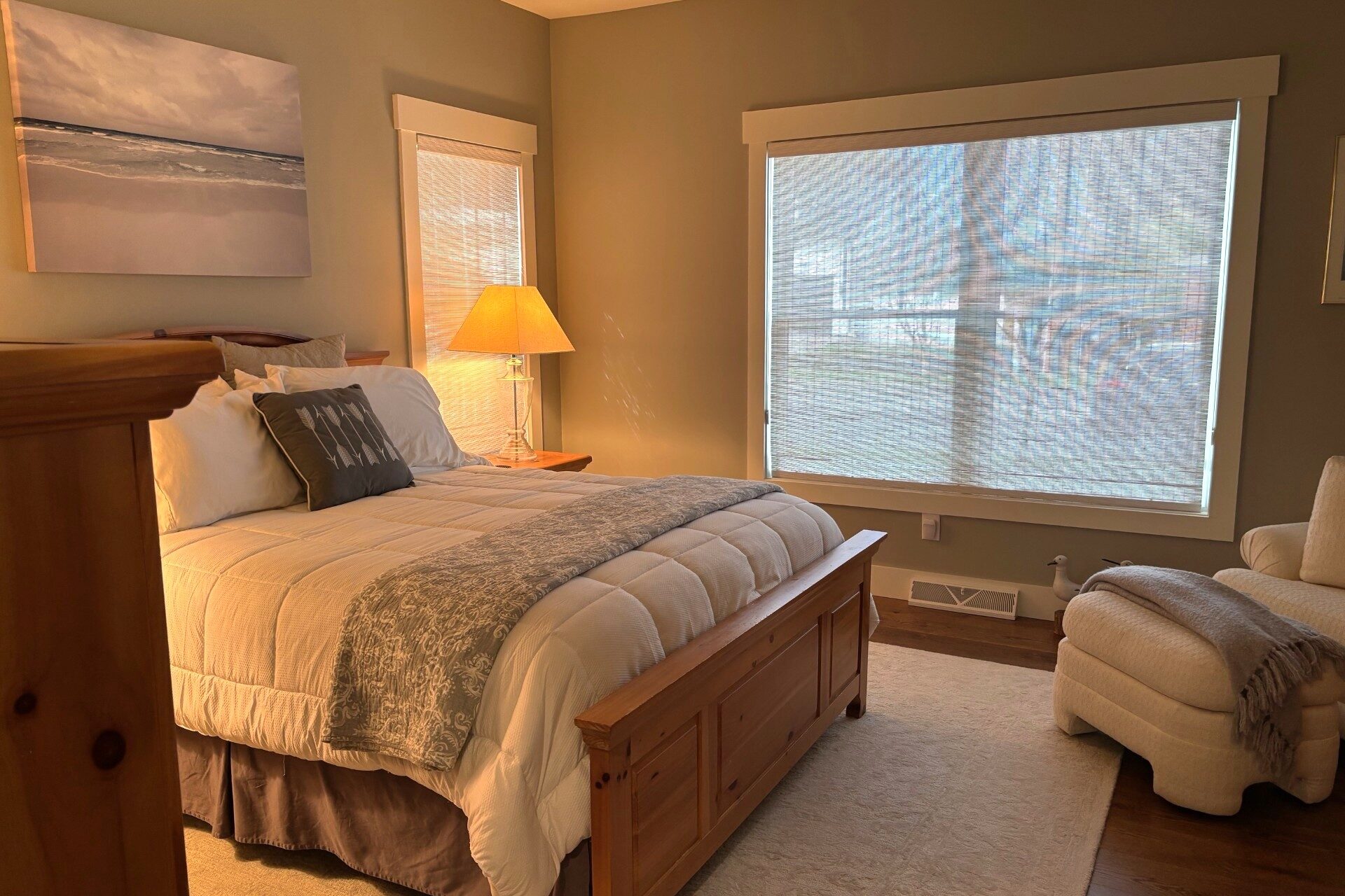 Fabulous 3 bedroom. 3 bath home has everything you need and more! Open floor plan with charming details inside and out. The main floor features a gournet kitchen, spacious living/dining areas and sliders to a large 3-season room, as well as a bedroom (Queen bed) and full bath. Upstairs there is a large primary suite with stunning bathroom and walk-in closet. The third bedroom has a Queen bed (with twin bunk aove), and an office area, with another full bath in the hallway. Central air, wireless internet and a TV in every room complete the perfect picture.