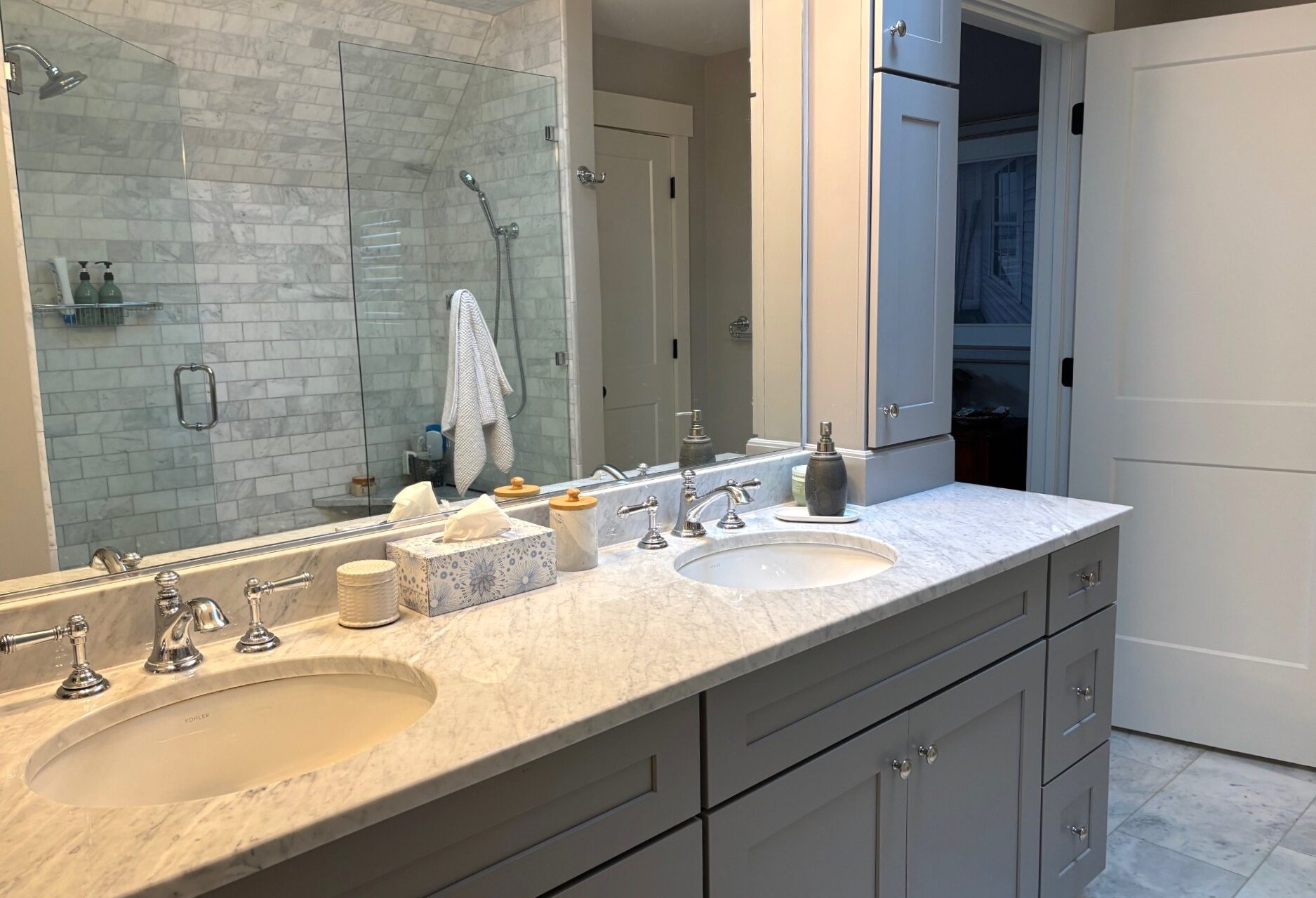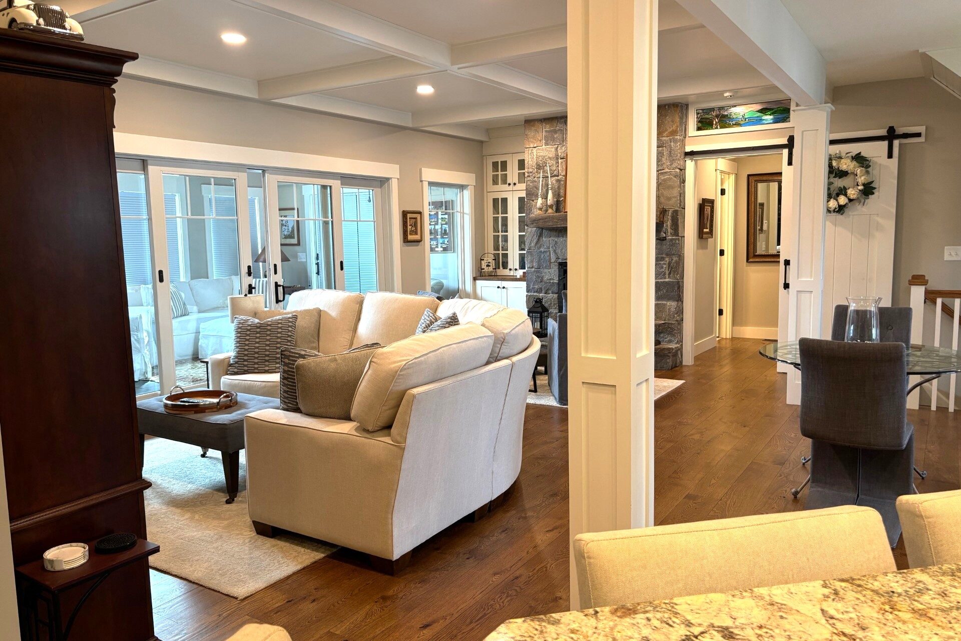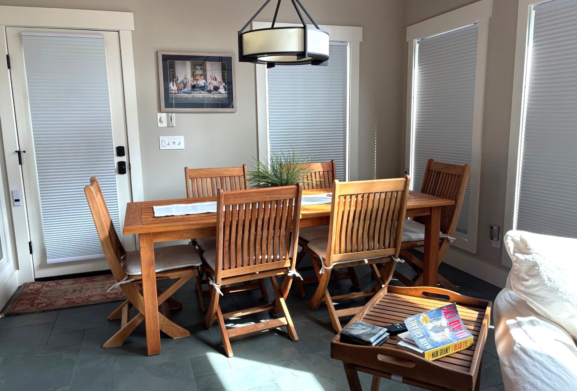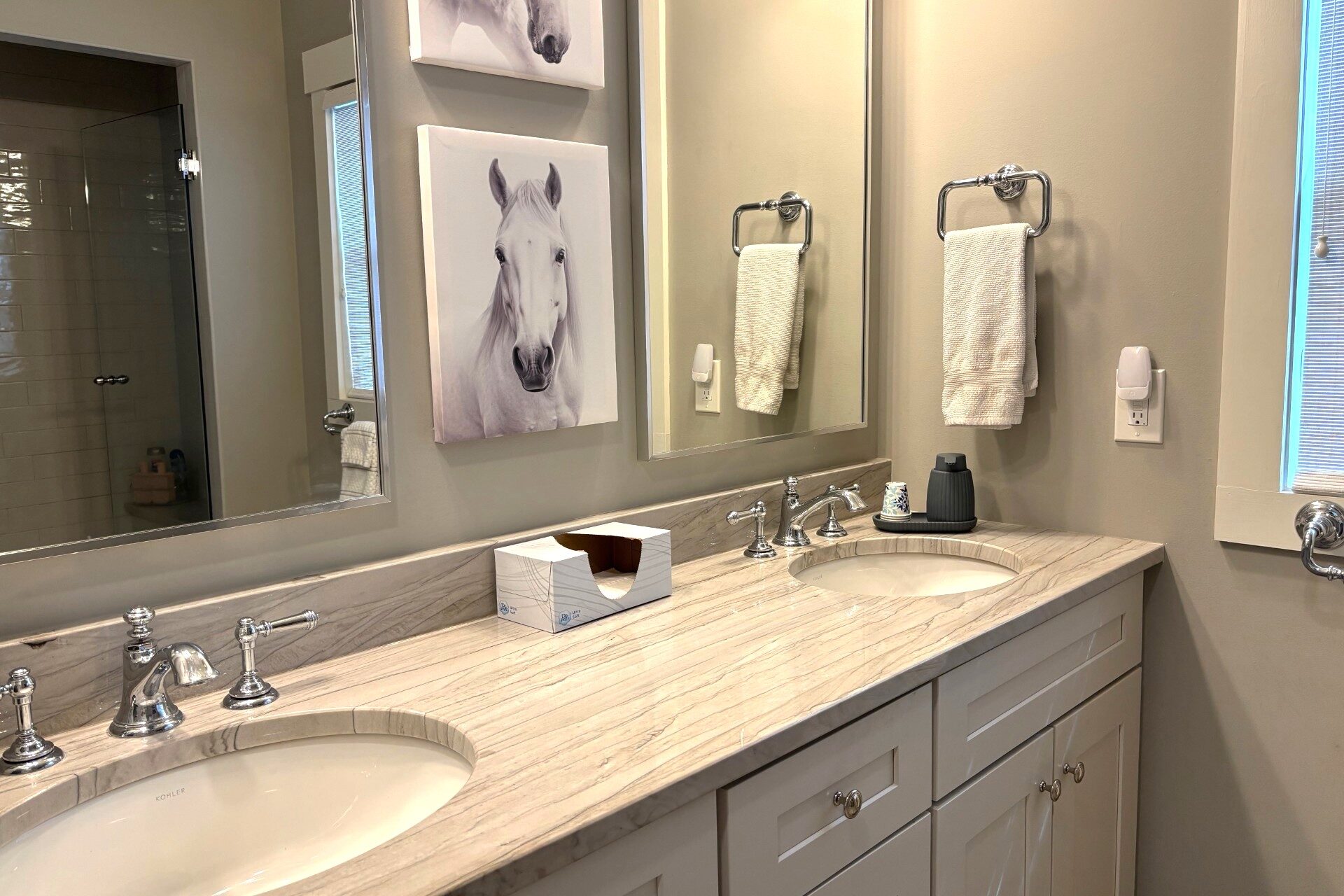 Fabulous 3 bedroom. 3 bath home has everything you need and more! Open floor plan with charming details inside and out. The main floor features a gournet kitchen, spacious living/dining areas and sliders to a large 3-season room, as well as a bedroom (Queen bed) and full bath. Upstairs there is a large primary suite with stunning bathroom and walk-in closet. The third bedroom has a Queen bed (with twin bunk aove), and an office area, with another full bath in the hallway. Central air, wireless internet and a TV in every room complete the perfect picture.